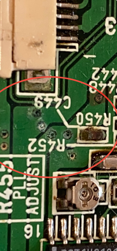 - Unfortunately, while removing the last capacitor, one of the PCB traces broke off completely, leaving no visible pad or trace to solder onto.
