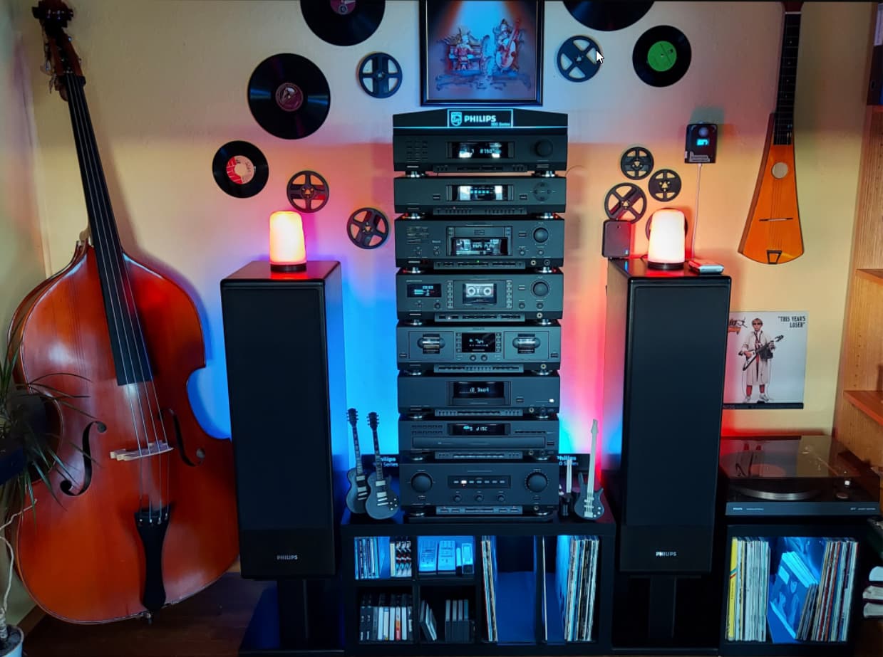 My Philips stereo. It includes a DCC900 which I’ve been able to repair partly. The 2 famous PCBs are cleaned and all SMD caps have been replaced by new SMD caps. It plays and records DCC, but it is apparently still not able to read/write the AUX channel from/to DCC tapes. Sometimes it is able to extract the album title of the Demo DCC tape (“PHILIPS DCC”), but generally no text, index number or time-code is displayed. There are a few infrequent dropouts (especially on one of the cassettes, witch makes a bit of mechanical noise when in use). Playing analog tapes (just for testing) there is a lot of white noise covering most of the signal on one of the channels.