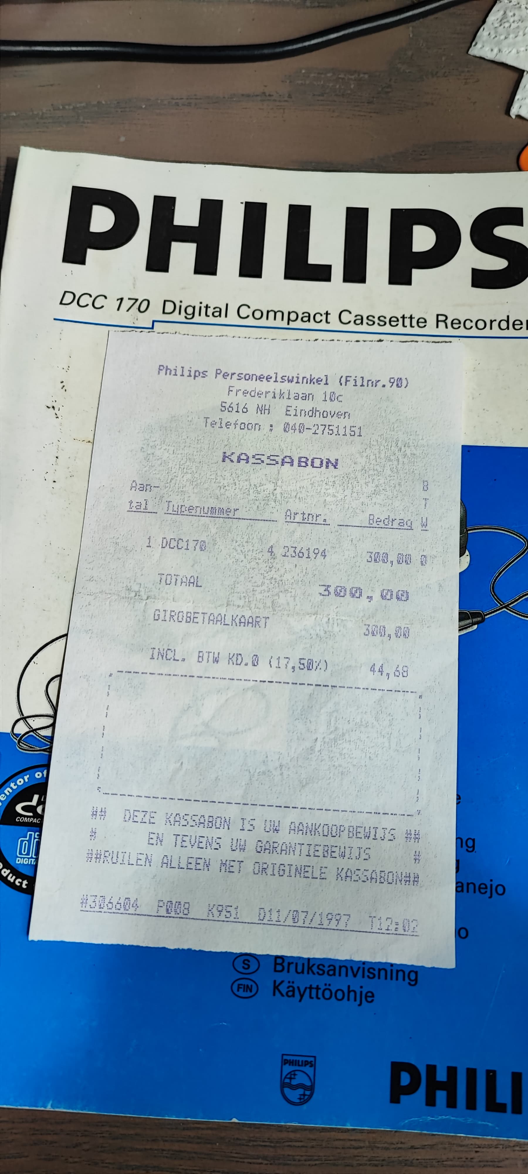 Found something interesting. In a user manual for the DCC 170, I discovered a receipt from the employee store in the Philips shop at the PSV stadium in Eindhoven. Unfortunately, the player isn’t working well. Would I still get a warranty if I brought the player in for repair there?