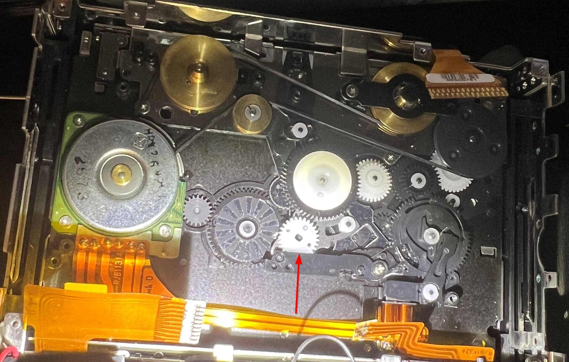 After it clicked into place, I was able to capture the video below. There was an analog cassette loaded at the time, and the first time you see action, I pressed the play button. This resulted in the clicking back and forth. Then I pressed rewind, and it seems that the gear engages correctly for a couple of seconds, but then it goes back into the clicking.