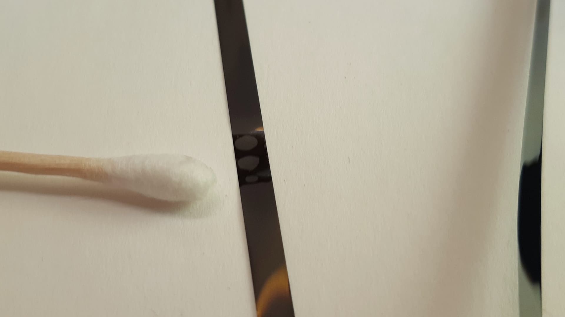 Third, place the tape with the back of the tape up, on a flat and clean surface where you can shine a bright light on it. Find the spots where there is some (greasy) residu visible. It will probably repeat every 10cm or so.